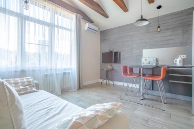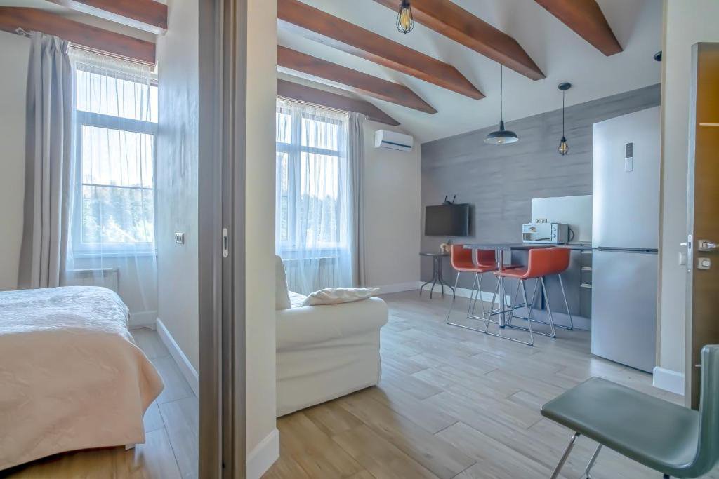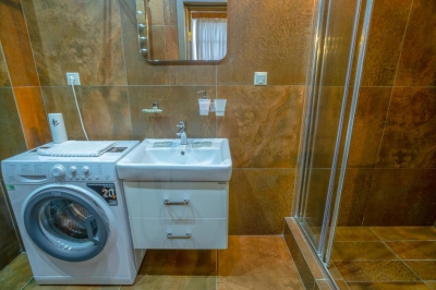Апартаменты с диваном, электрическим чайником и стиральной машиной.